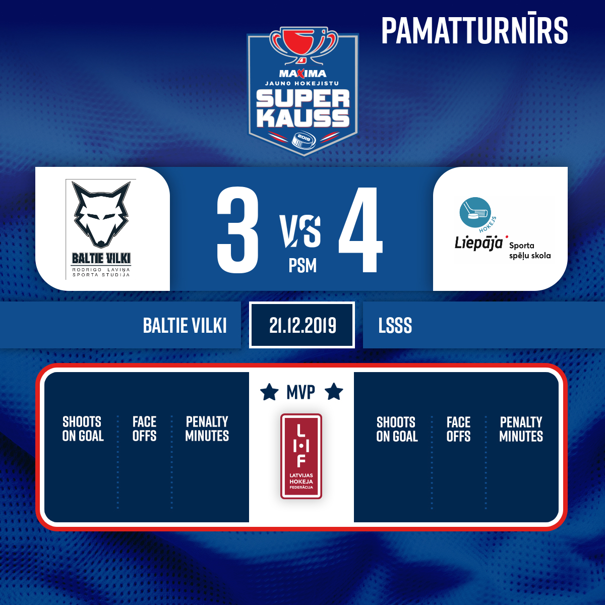 - 55:30P3Powerplay goal, empty net#11 Jānis GRIGAĻŪNSAssists: #6 Kristers KVIESIS, #92 Kristofers PETRIŅŠVārti gūti vairākumā +1