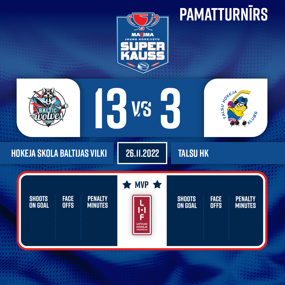 - 28:34P2Goal#13 Gustavs BURNEVICSAssist: #14 Ričards BALODIS