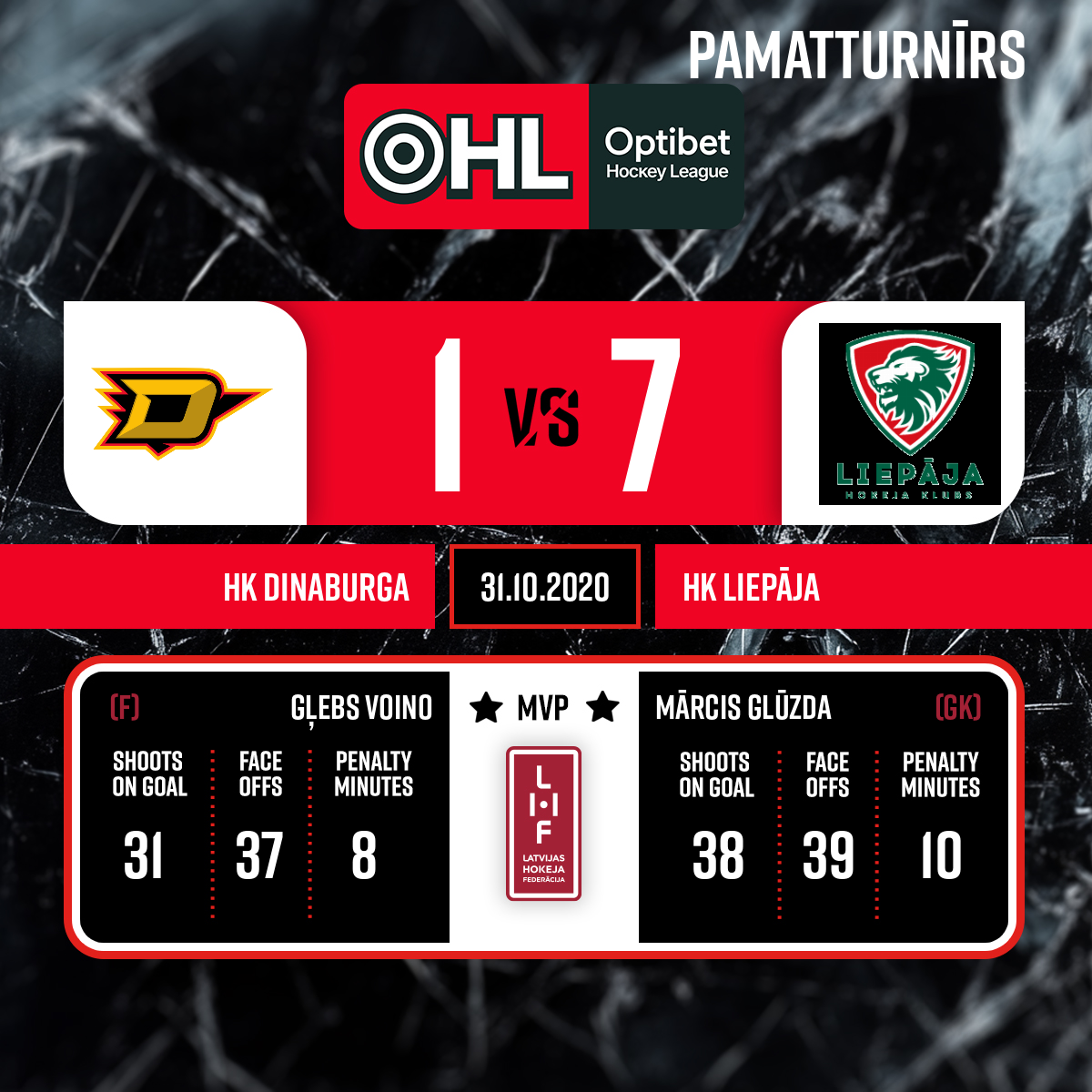 - 60:00P3Labākais spēlētājs HK Dinaburga komandā #71 Glļebs Voino. Labākais spēlētājs HK Liepāja komandā #30 Mārcis Glūzda.