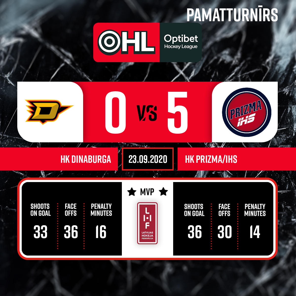 - 60:00P3Spēles labākie spēlētāji: HK Dinaburga – Ivo Haritonovs Nr. 55, HK Prizma/IHS –Rihards Norvaišs Nr. 71.