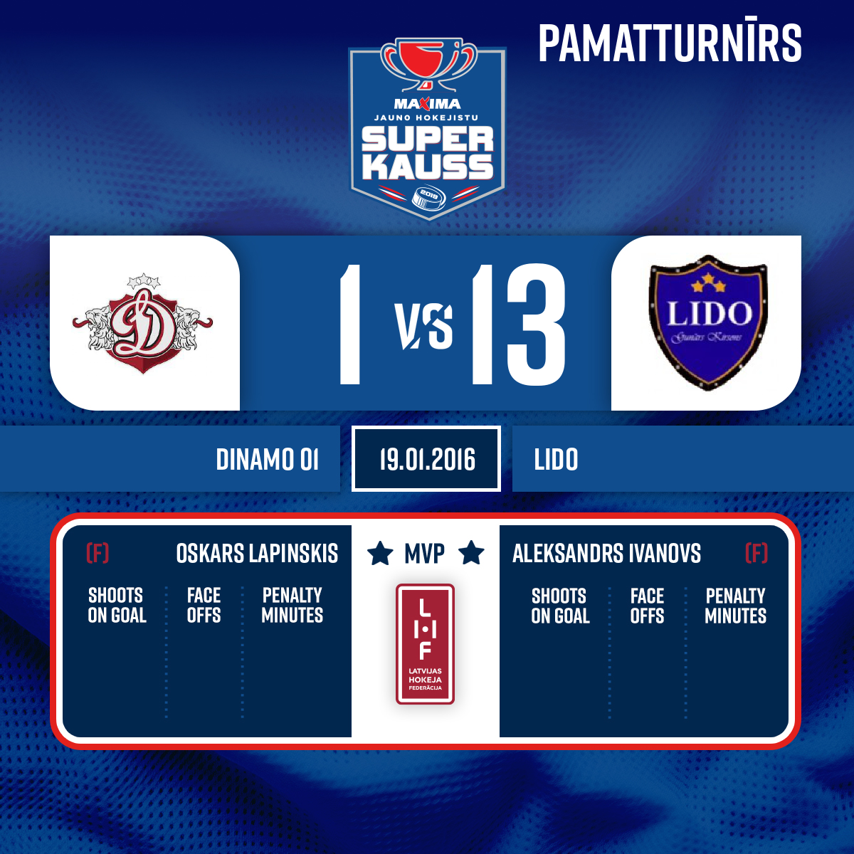 - 02:38P1Goal#16 Miks TUMĀNOVSAssists: #23 Ralfs JEVDOKIMOVS, #33 Deniss VILMANS
