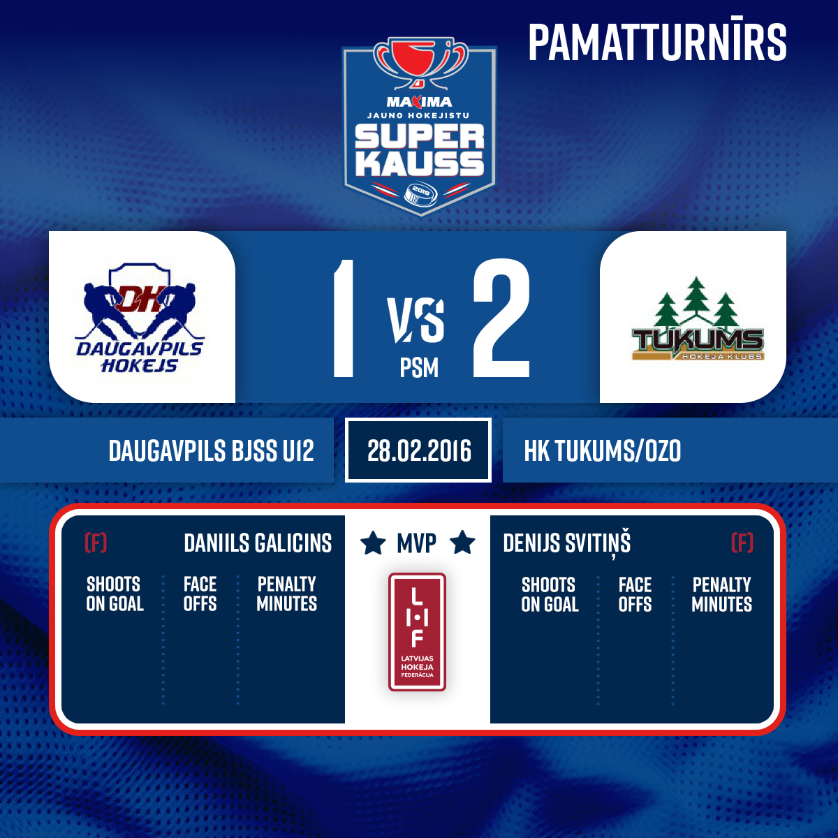 - 45:00P3Spēles labākie spēlētāji: Daugavpils BJSS -#27 Daniils Gaļicins, HK Tukums - #7 Denijs Svitiņš.