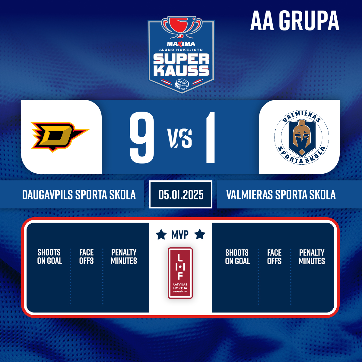 - 30:19P2Goal#8 Vladislavs DALIŠEVSKISAssists: #13 Artjoms MARKOVS, #27 Danila JAKIMOVIČS