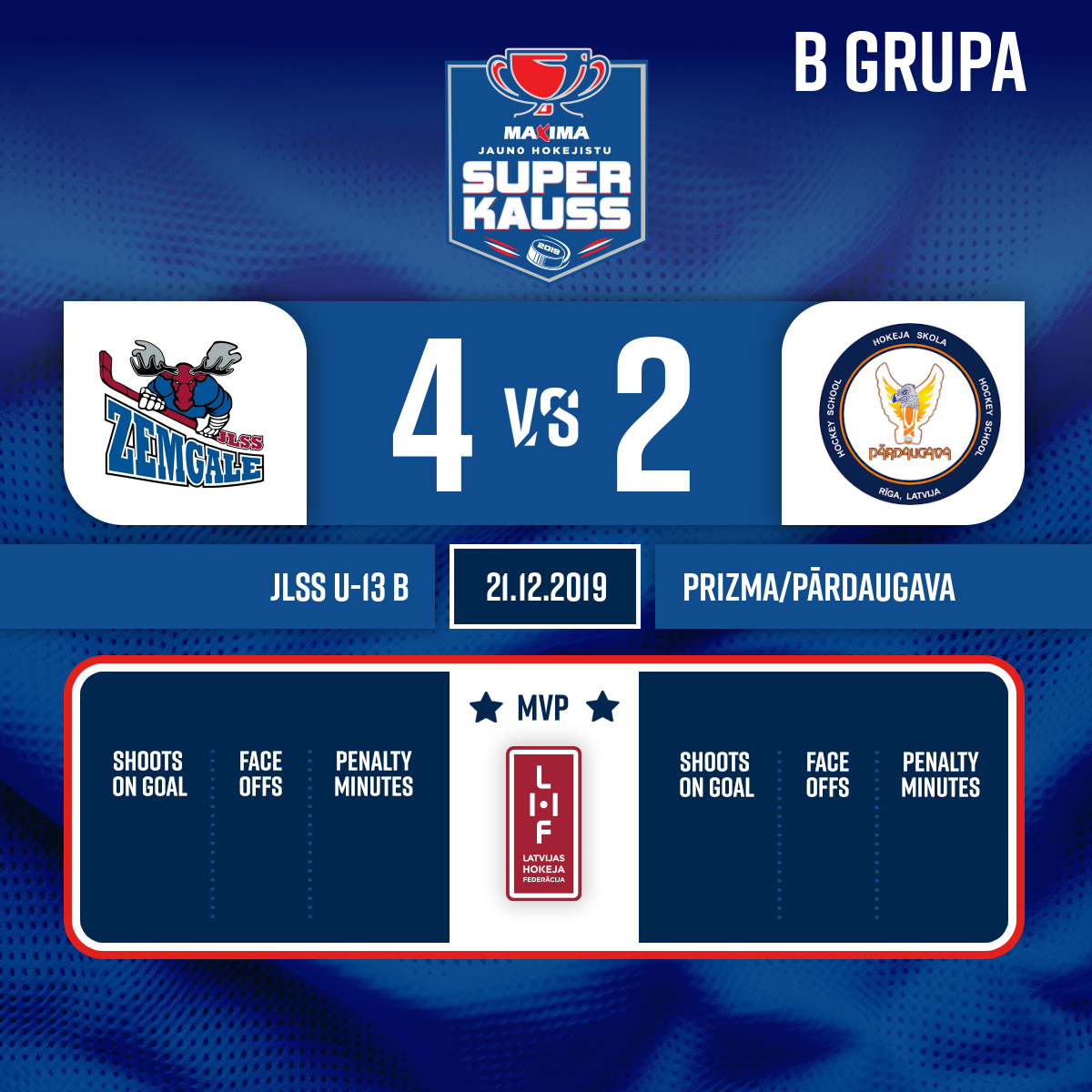 - 21:33P2Goal#17 Bruno VIMBAAssists: #22 Markuss VĀLODZE, #9 Olafs BINDULIS