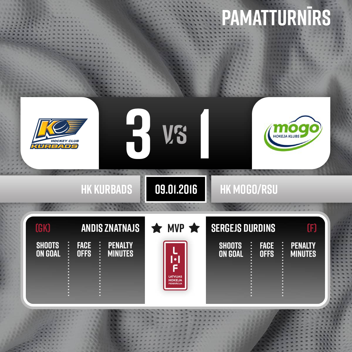 - 60:00P3Spēles labākie spēlētāji: HK Kurbads #43 Andis Znatnajs; HK Mogo #10 Sergejs Durdins