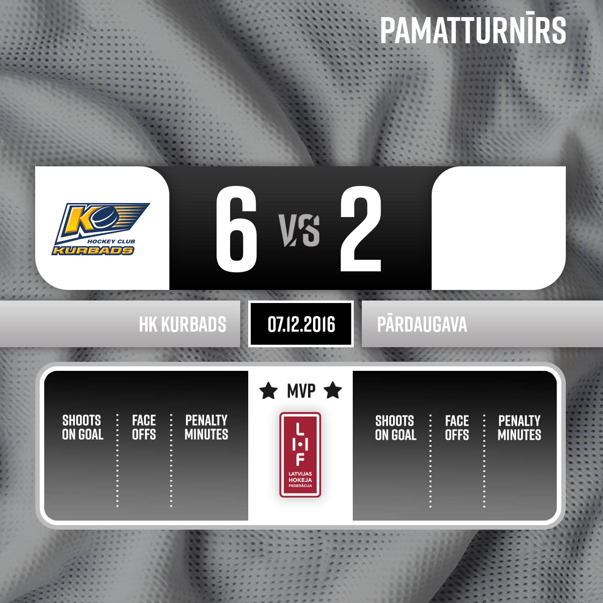 - 60:00P3Spēles labākie spēlētāji; HK Kurbads #76 Arvils Bergmanis Pārdaugava #10 Jānis Ričards Kārkliņš