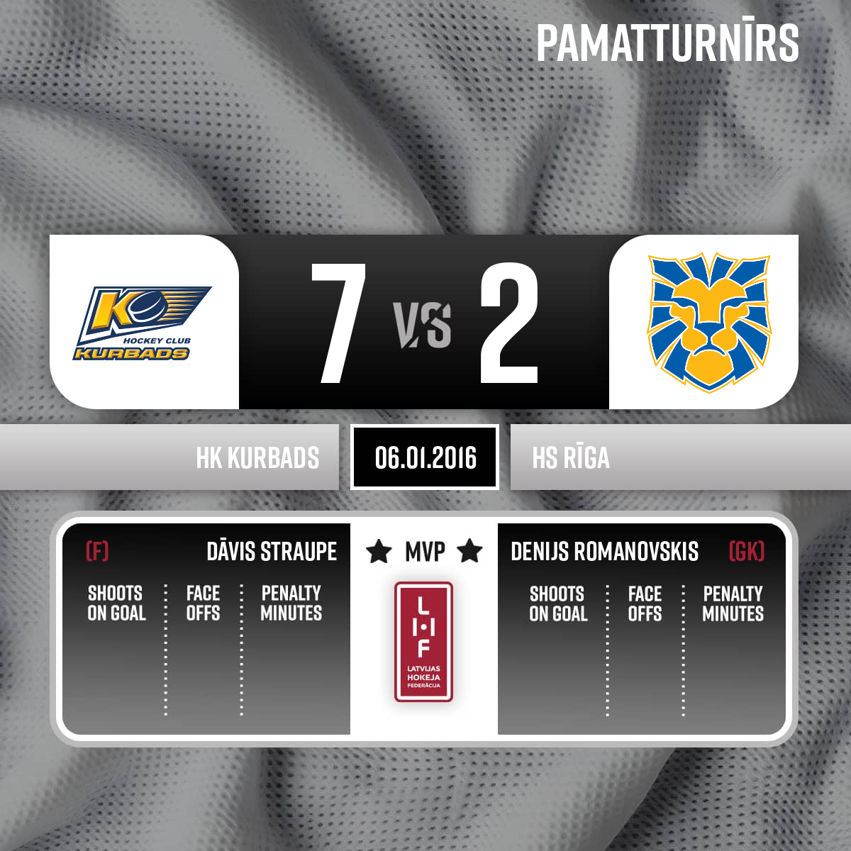 - 60:00P3Spēles labākie spēlētāji; HK Kurbads #9 Dāvis Straupe; HS Rīga #1 Denijs Romanovskis