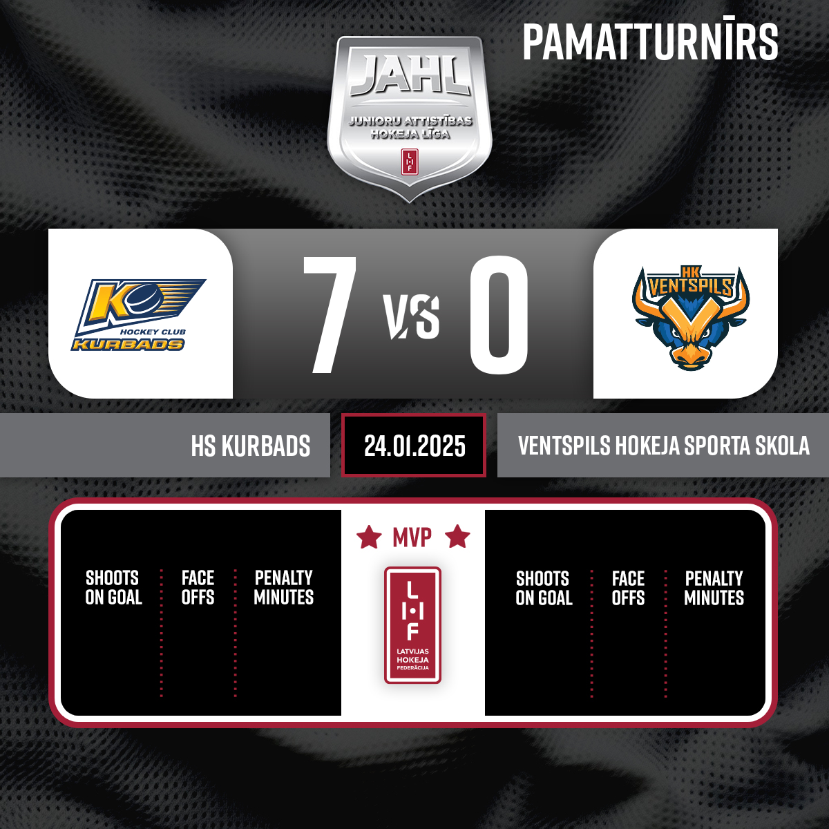 - 60:00P3Goalkeeper out#1 Kirils SOPULIS
