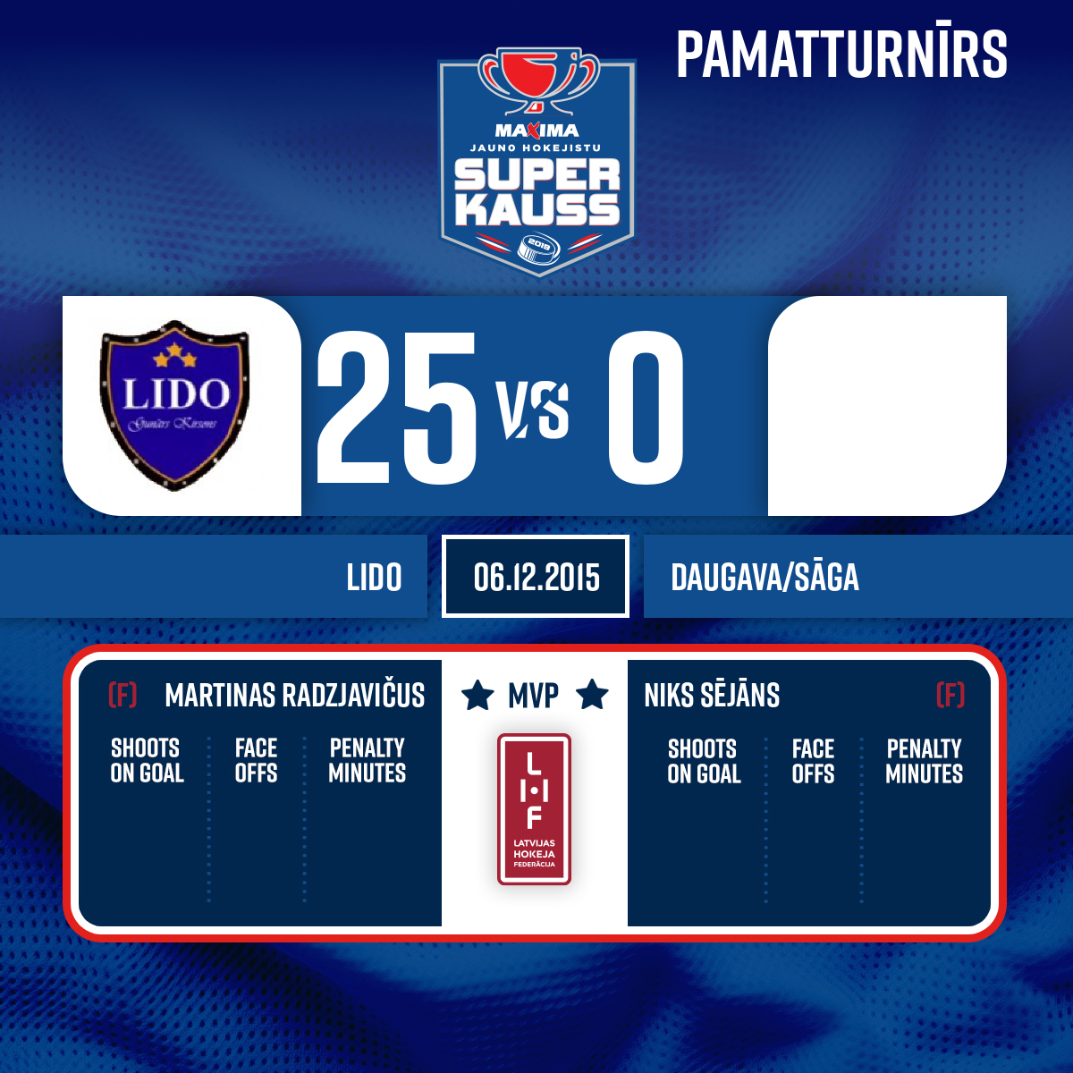 - 12:01P1Goal#14 Aleksandrs BIŠKINSAssists: #7 Arkādijs TOPOĻEVS, #24 Patriks OZOLS