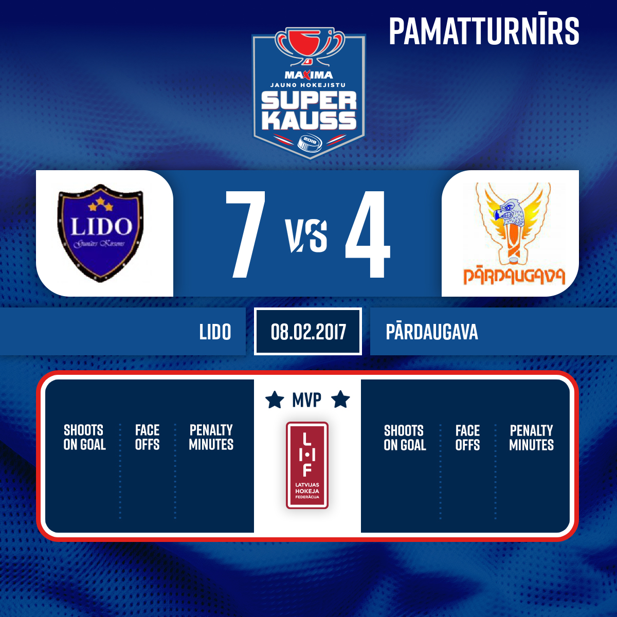 - 19:17P1Powerplay goal#79 Ņikita MATEIKOAssists: #50 Emīls MASTEIKO, #24 Patriks OZOLS