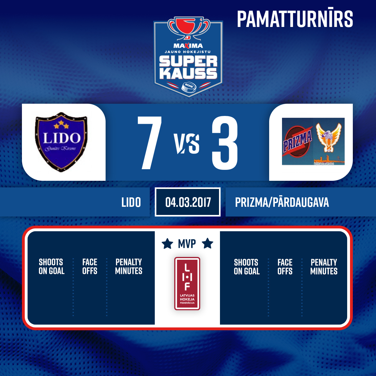 - 54:34P3Goal#79 Ņikita MATEIKOAssists: #88 Kristaps SKRASTIŅŠ, #6 Everts OZOLS