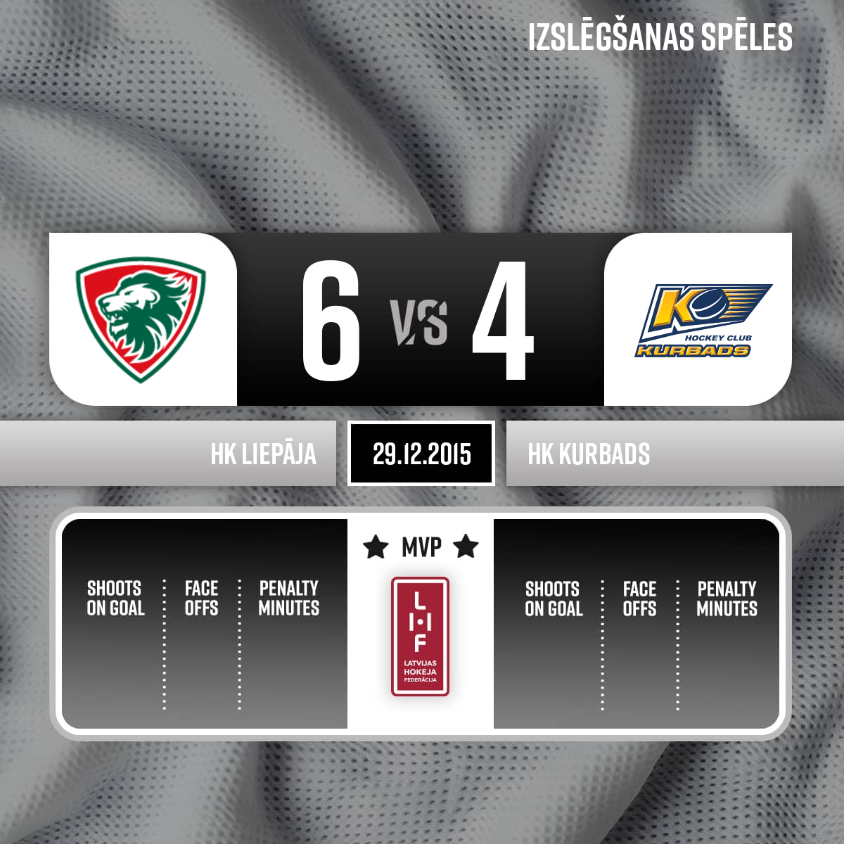 - 53:18P3Goal#10 Bruno ZABISAssists: #22 Klāvs PLĀNICS, #15 Māris DIĻEVKAvienādos