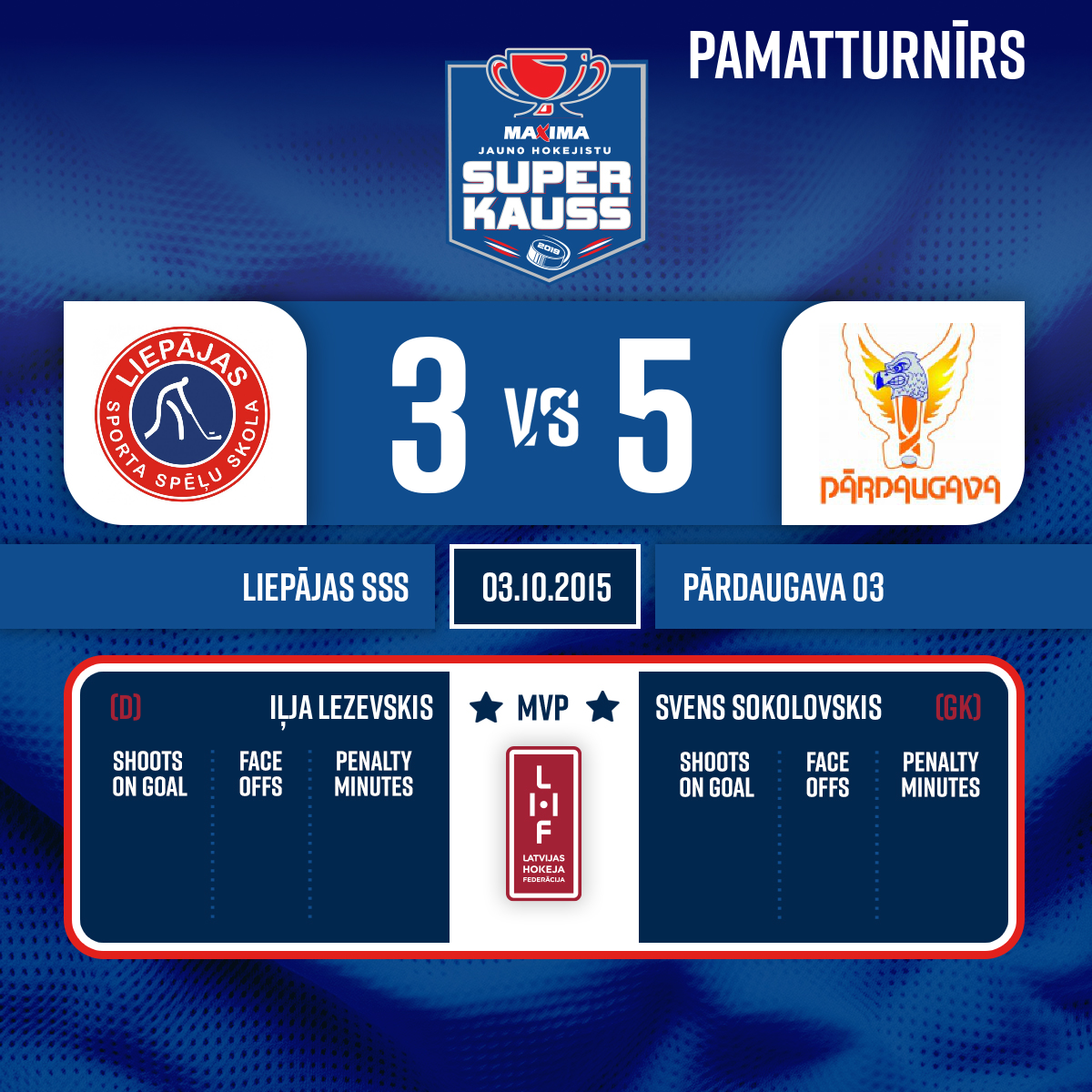 - 45:00P3Penalty - 10 minutesMisconduct, #9 Dāvis BOROZINSKIS