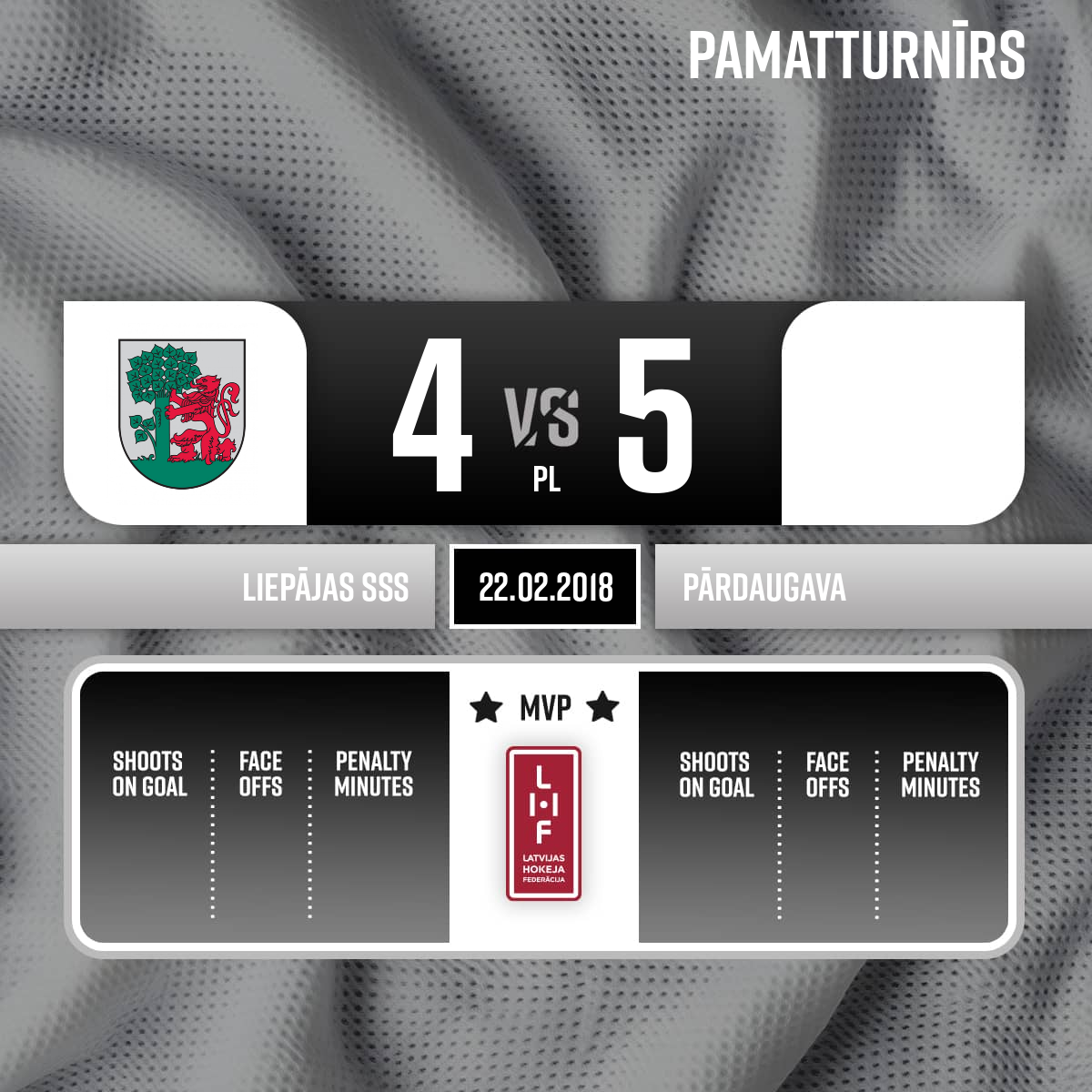 Goal#2 Ričards STĀMURSAssists: #13 Ņikita JENGAŠOVS, #9 Dmitrijs PAVLOVS - 00:00P1Spēles tiesneši: galvenais tiesnesis - Viesturs Lēvalds; līnijtiesneši - Jānis Beķeris un Aleksejs Propošins