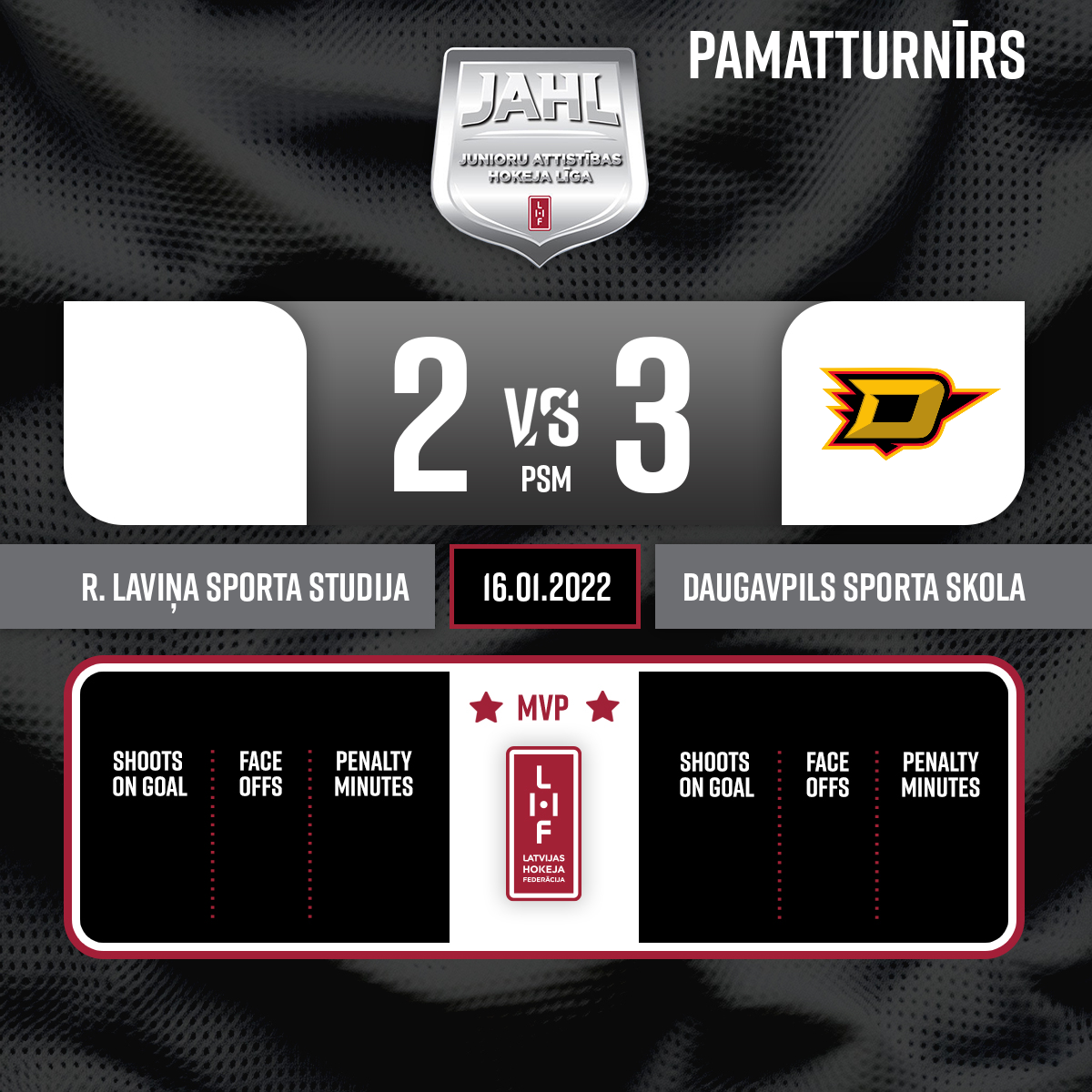 Assists: #9 Maksims PUMPIŅŠ#4 Maksims GALILEJEVS2:1PP1, 16:28- #77 Patriks TRASÛNSAssists: #23 Rihards SIMANOVIČS#73 Miks KOMULS2:013:07