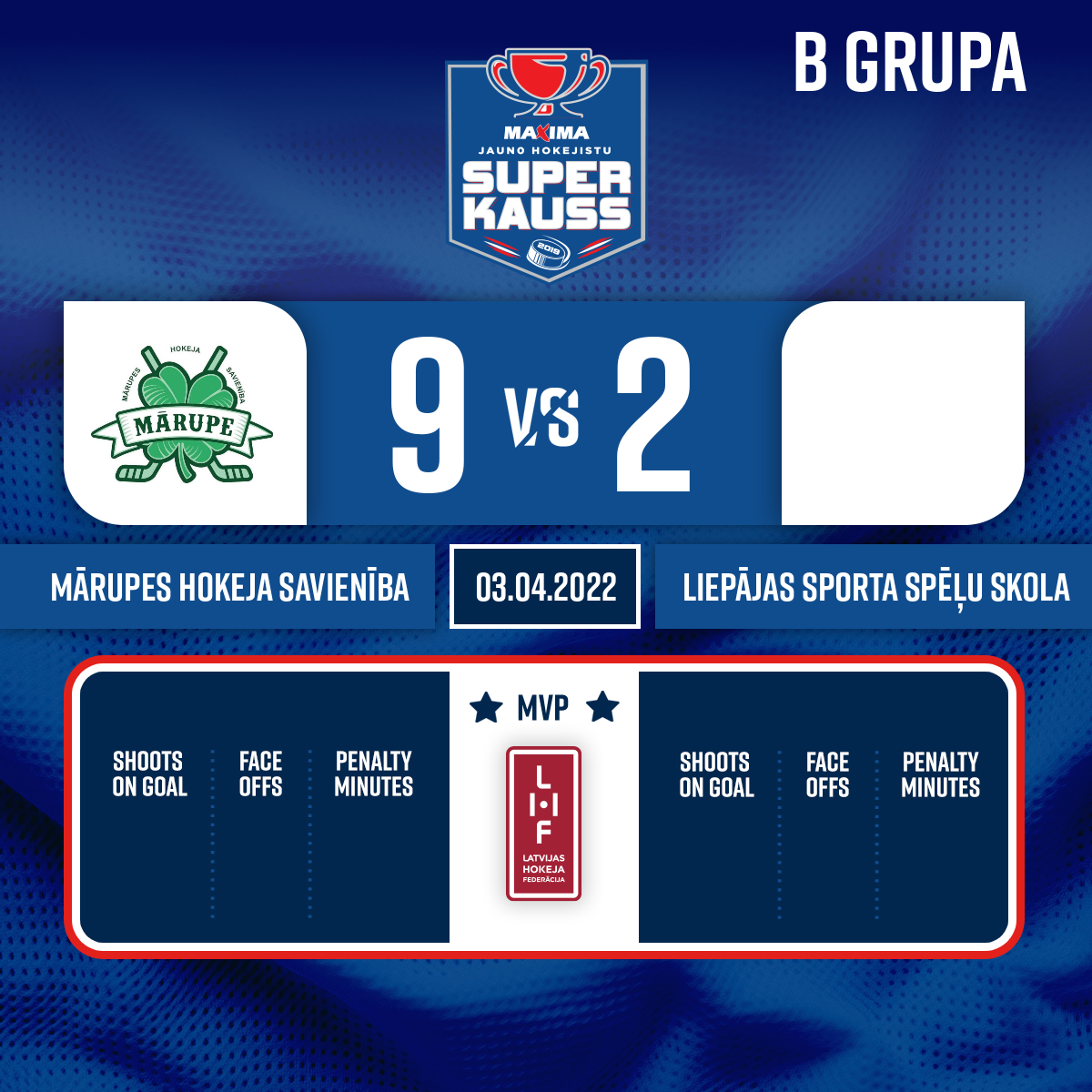 - 45:00P3Goalkeeper out#39 Domeniks MARTINOVS VĪNKALNS