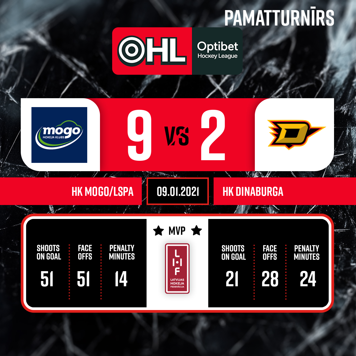 - 60:00P3Labākie spēlētāji: HK Mogo - #22 Andris SIKSNIS HK Dinaburga - #26 Vladislavs BARKOVSKIS