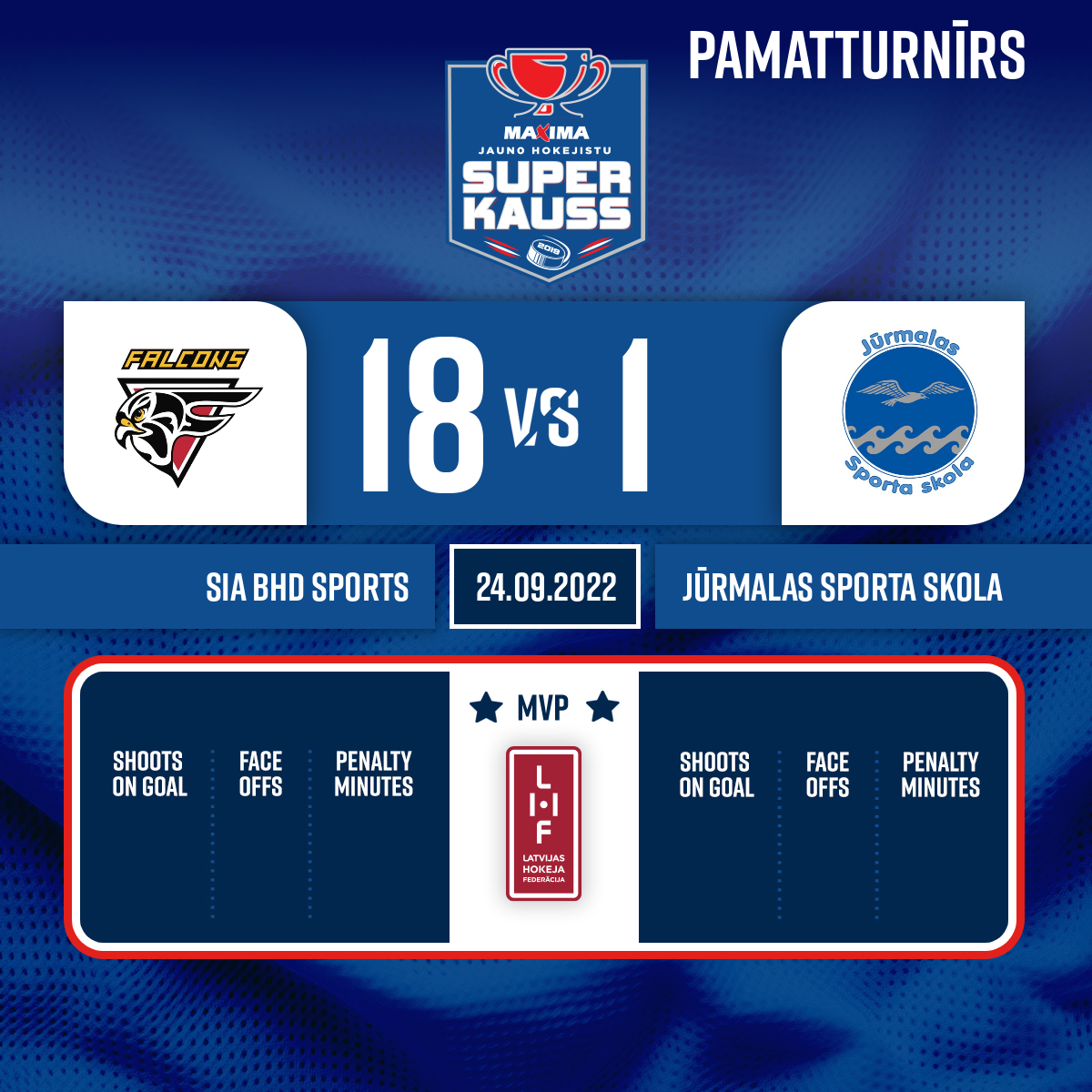 - 16:57P1Goal#20 Artūrs SMISLOVSAssists: #27 Jānis LEJA, #25 Ronalds MIĶELSONS