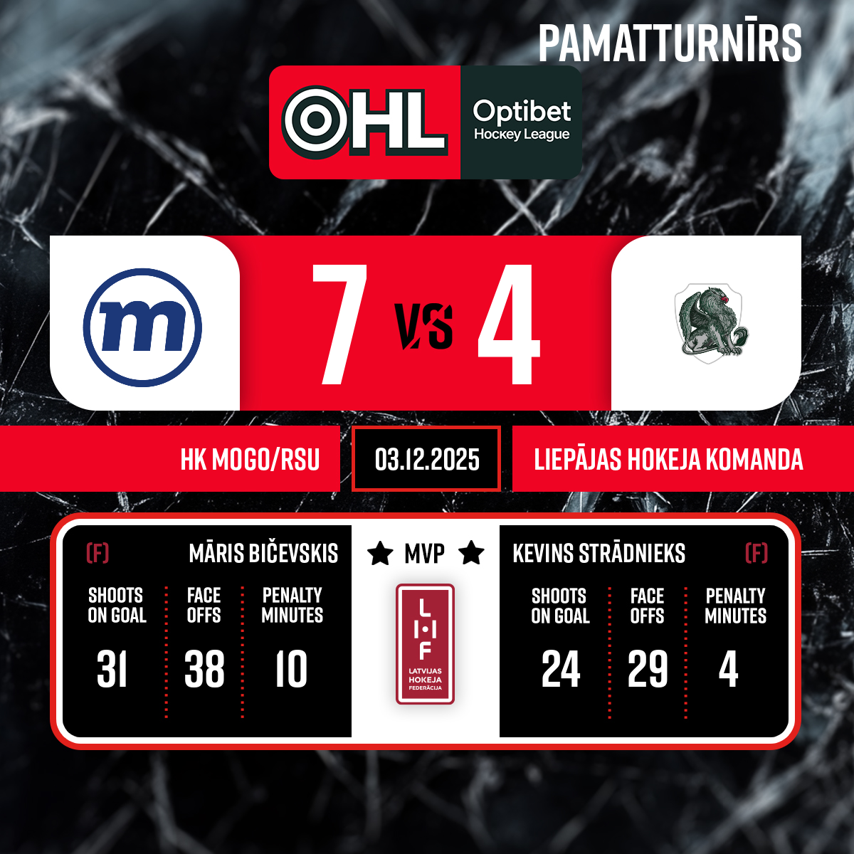 Goal#8 Gustavs KRŪMIŅŠAssists: #72 Kevins STRĀDNIEKS, #18 Ralfs GRINBERGS - 40:00 Start of the 3rd period