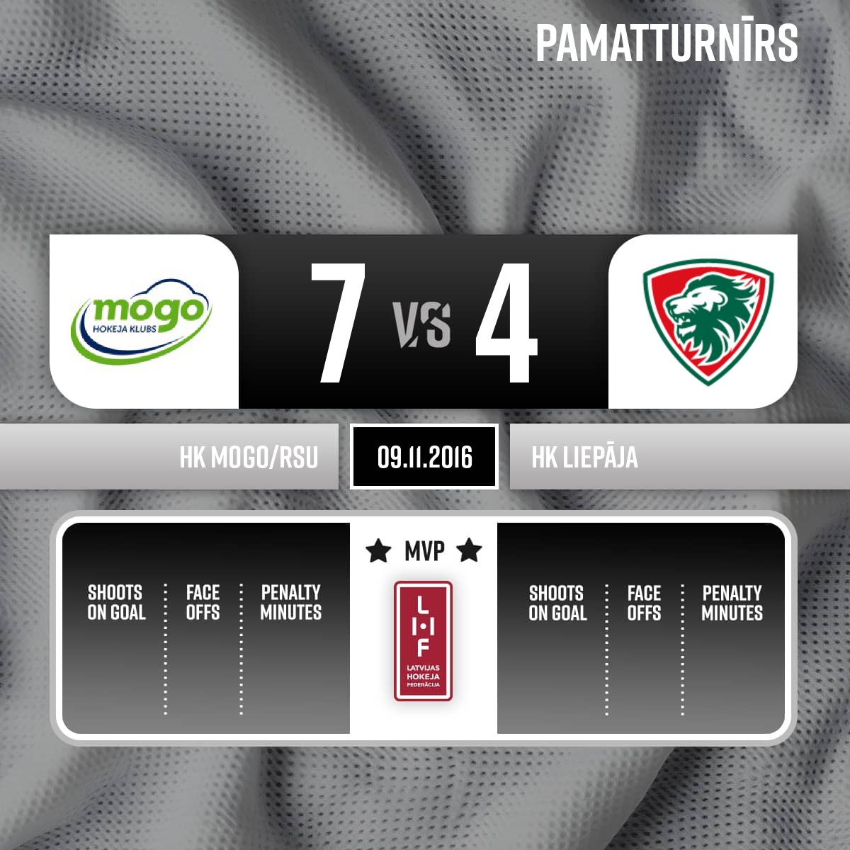- 60:00P3Spēles labākie spēlētāji: HK "Mogo" - #28 - Vladimirs Mamonovs; HK "Liepāja" - #13 - Klāvs Plānics