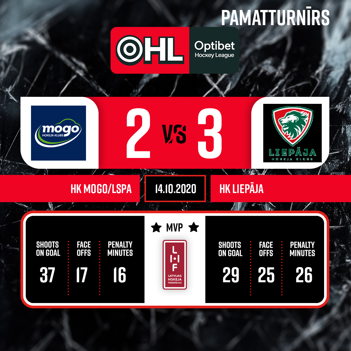 - 60:00P3Labākie spēlētāji: HK Mogo/LSPA – Kaspars Saulietis #61 HK Liepāja - Rihards Ričards Fomins #88