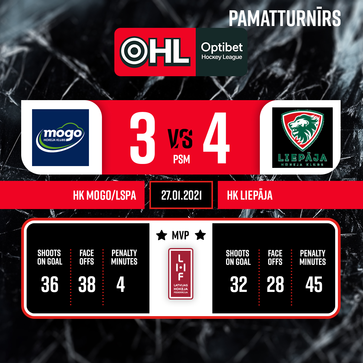 - 65:00OTLabākais spēlētājs HK Mogo/LSPA komandā nr.25 Ričards Grīnbergs Labākais spēlētājs HK Liepāja komandā nr.55 Artūrs Salija