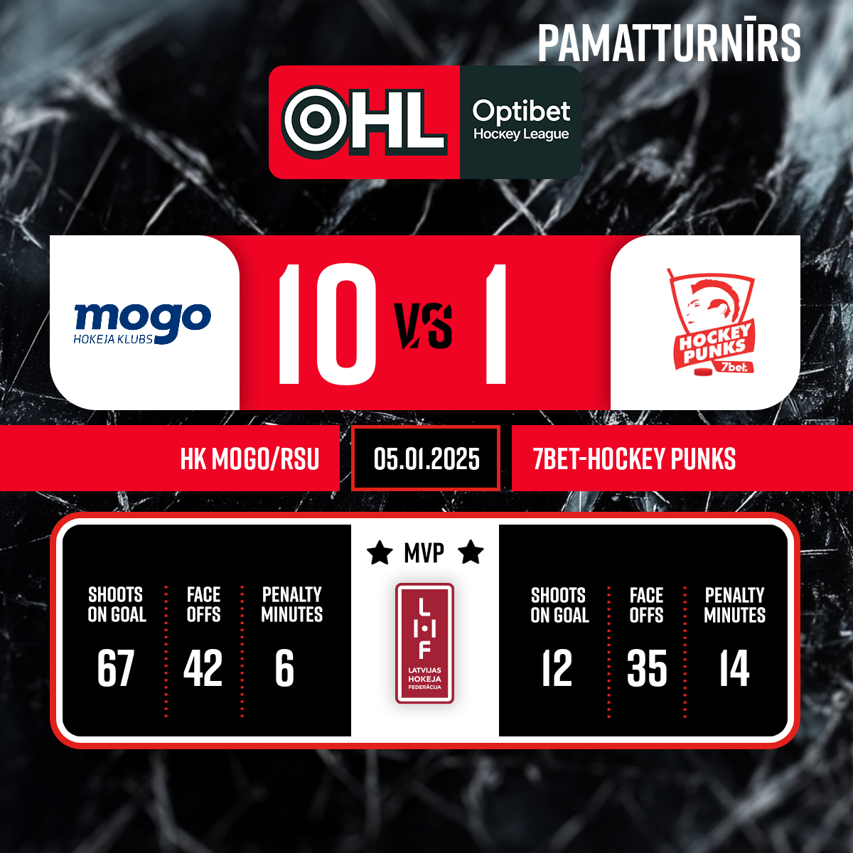- 60:00P3Spēles labākie spēlētāji: HK MOGO/RSU komandā Nr.87 MEIJA Gints; 7BET Hockey Punks komandā Nr.43 KRUKOVSKI Tomaš