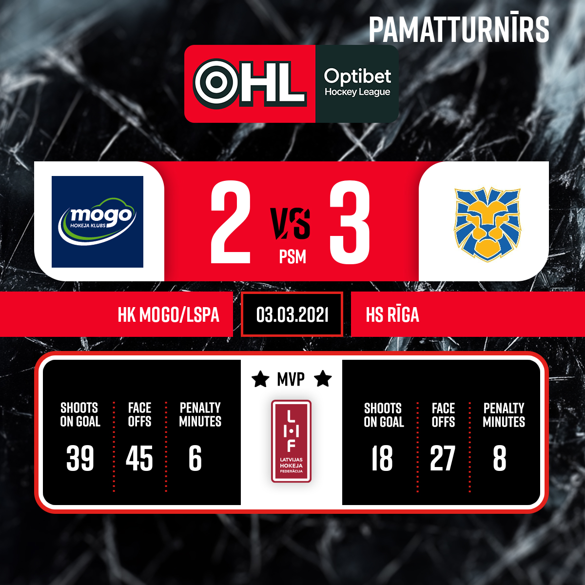- 65:00OTLabākais spēlētājs HK Mogo/LSPA komandā Nr.9 Gatis GRICINSKIS Labākais spēlētājs HS Rīga komandā Nr.17 Berts Dāniels UDZĪTIS