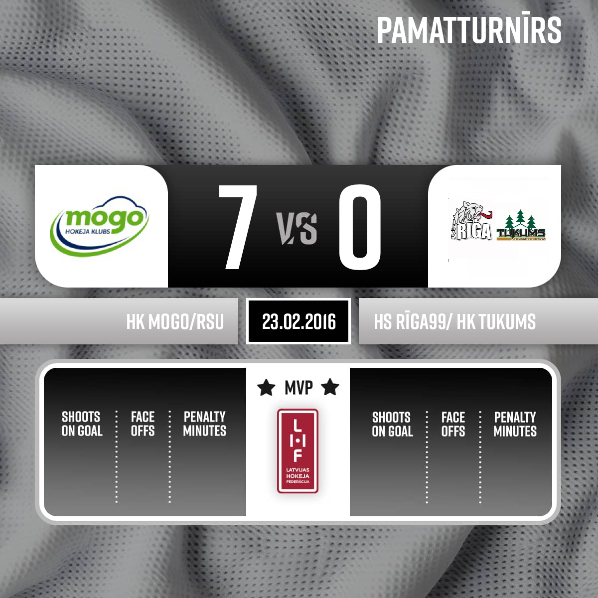 - 60:00P3* Labākie spēlētāji: HK Mogo- #7 Rustams Begovs; HS Rīga 99/HK Tukums - #18 Kārlis Gustavs Logins.