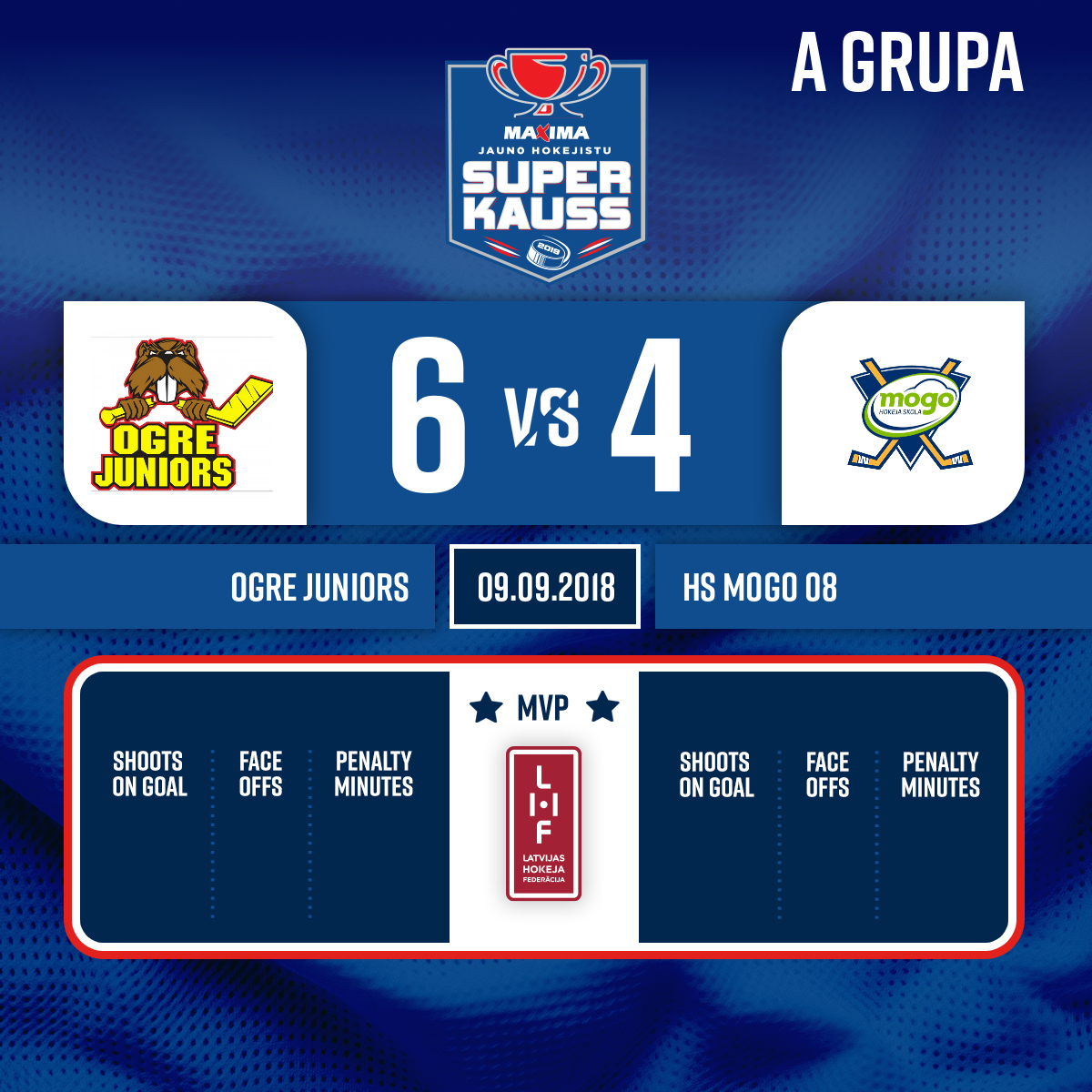 - 30:19P3Goal#17 Kristaps KATKOVSKISAssists: #35 Maksims MOROZOVS, #33 Deivids GINZBURGS