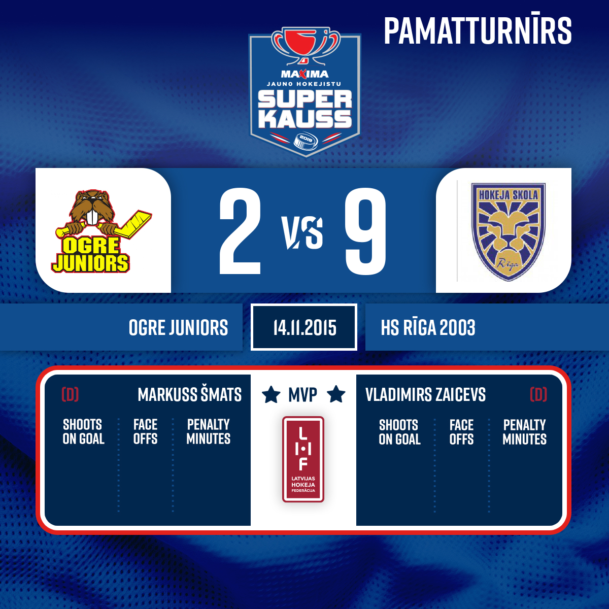- 45:00P3Spēles labākie spēlētāji: Ogre juniors #4 Markuss Šmats HS Rīga 2003 #22 Vladimirs Zaicevs
