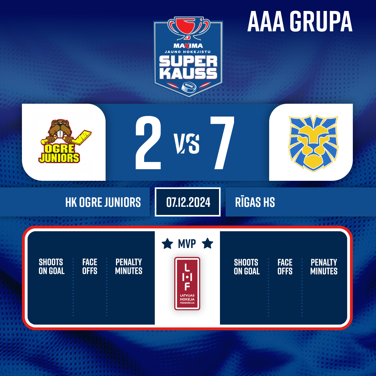 - 11:47P1Goal#12 Ārons MIEZĪTISAssists: #97 Alberts LAZAREVS, #27 Mateo JURGELIS