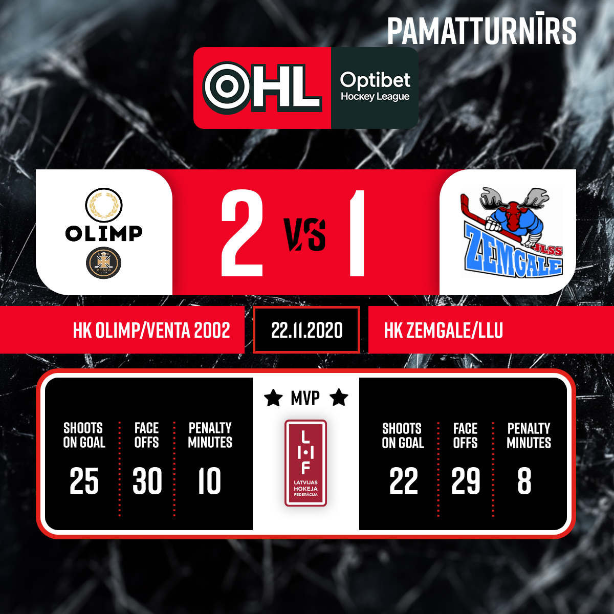 - 60:00P3Labākais spēlētājs HK Olimp/Venta 2002 komandā #62 Aleksejs Širokovs Labākais spēlētājs HK Zemgale/LLU komandā #55 Patriks Ozols