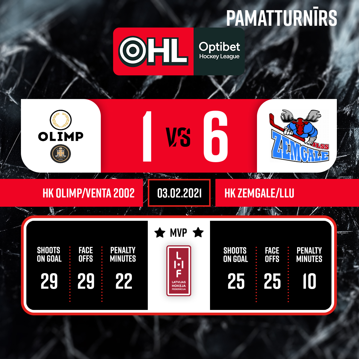 - 60:00P3Labākais spēlētājs: HK Olimp/Venta 2002 – Maksims Širokovs Nr. 33 HK Zemgale/LLU – Ričards Bernhards Nr. 97