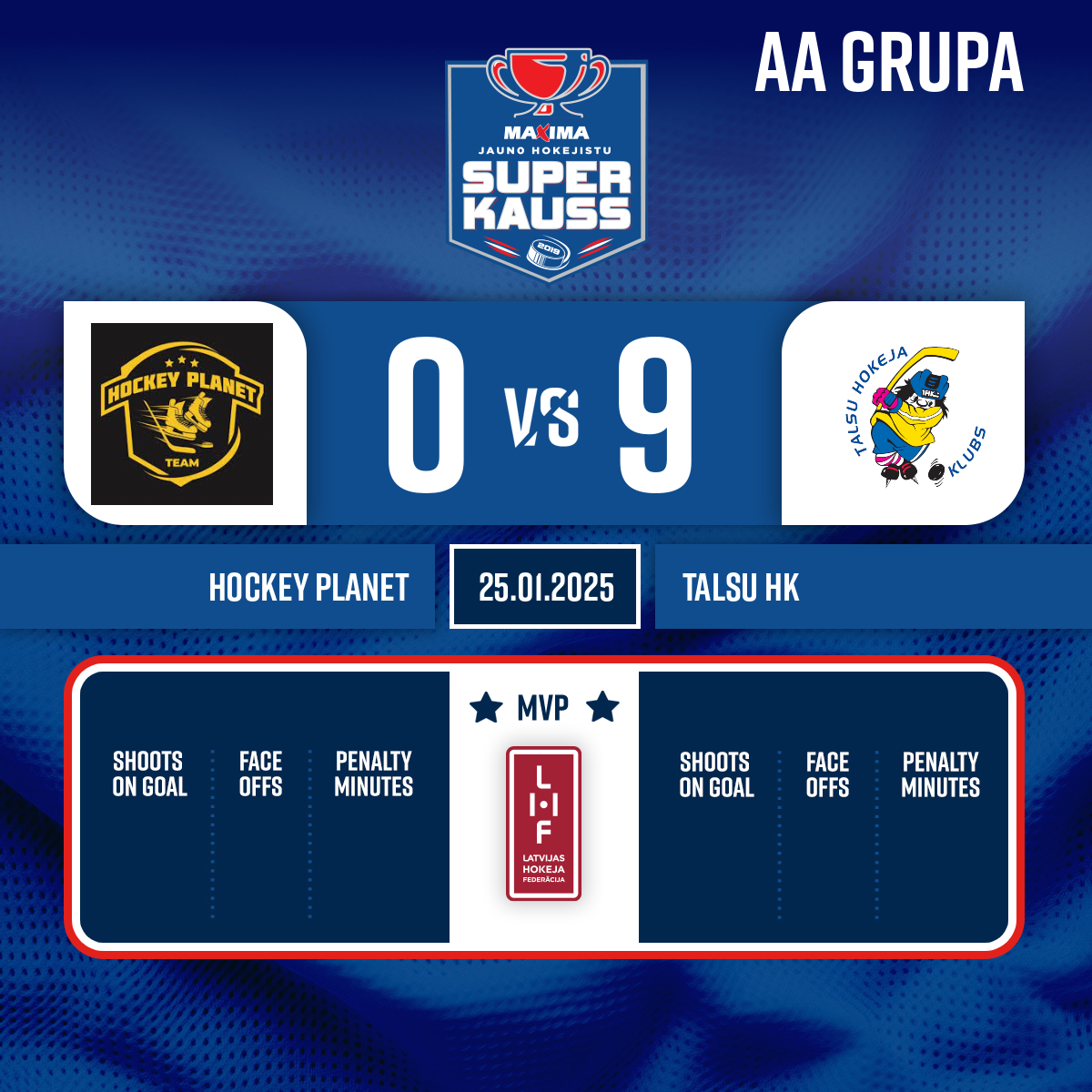 - 30:45P3Goal#20 Lenijs ANZENAVSAssists: #21 Kārlis OZOLNIEKS, #13 Eduards BĀRTULIS
