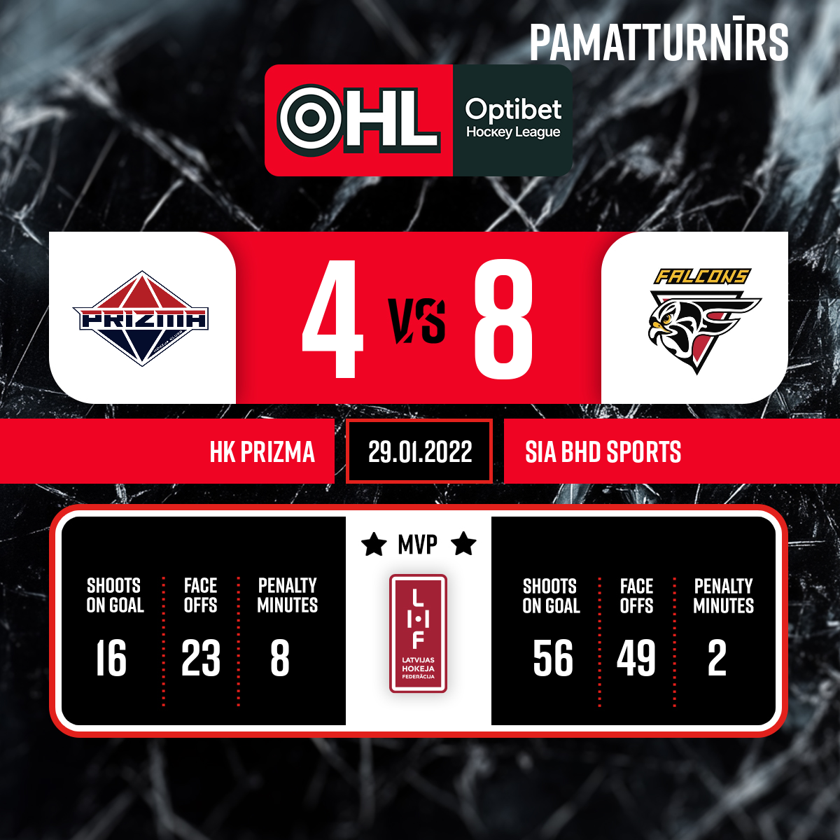 - 60:00P3Goalkeeper out#32 Linards LIPSKIS