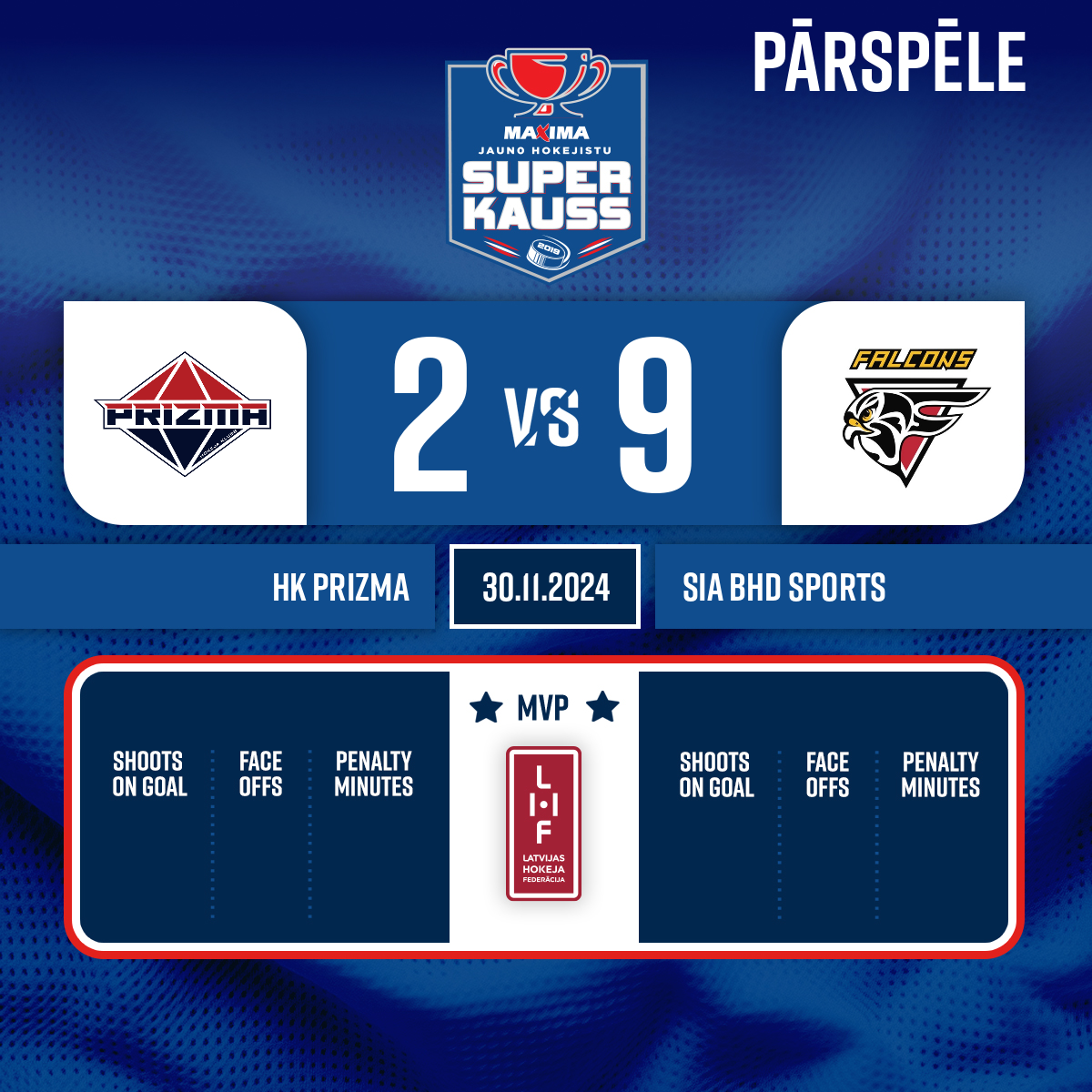 - 60:00P3Goalkeeper out#30 Feliks OĻEIŅIKOVS