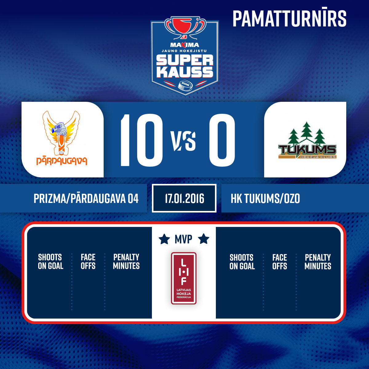 - 19:00P2Goal#61 Deniss BALSEVIČSAssists: #91 Kirils TABATČIKOVS, #9 Kristers APSĪTIS