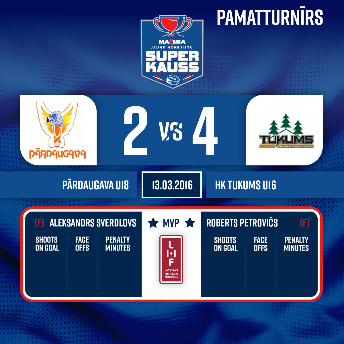 - 22:15P2Goal#33 Ričards STĀMURSAssist: #29 Aleksandrs SVERDLOVS