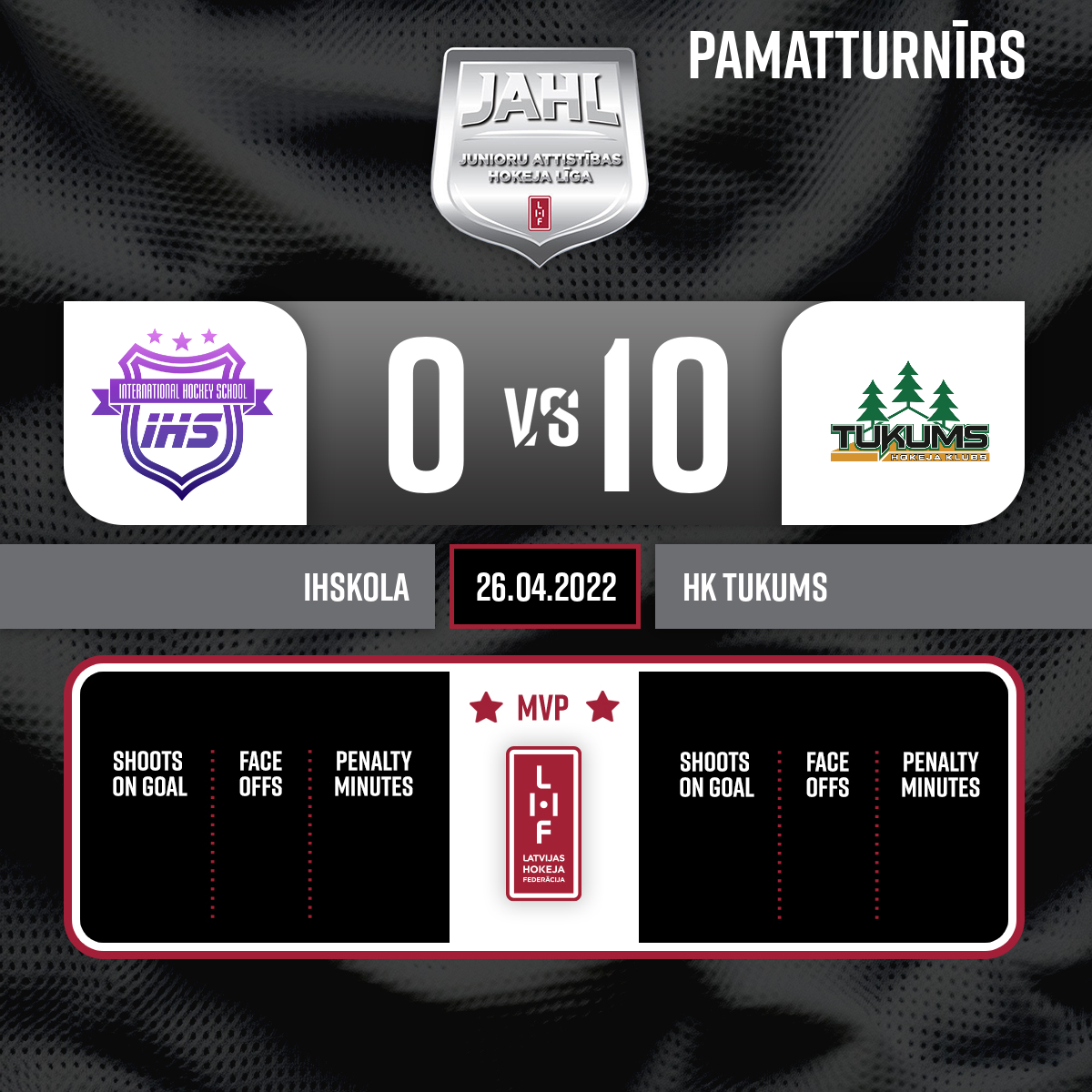 - 15:19P1Goal#13 Mārtiņš ŠULCSAssists: #22 Gustavs MILLERS, #53 Ģirts SILKALNS