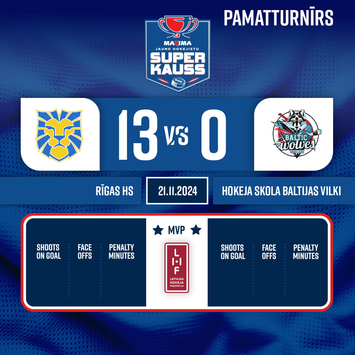 - 16:07P1Goal#23 Kristaps KANDISAssists: #19 Sanders Ralfs KRŪMIŅŠ, #24 Ņikita VENGERS