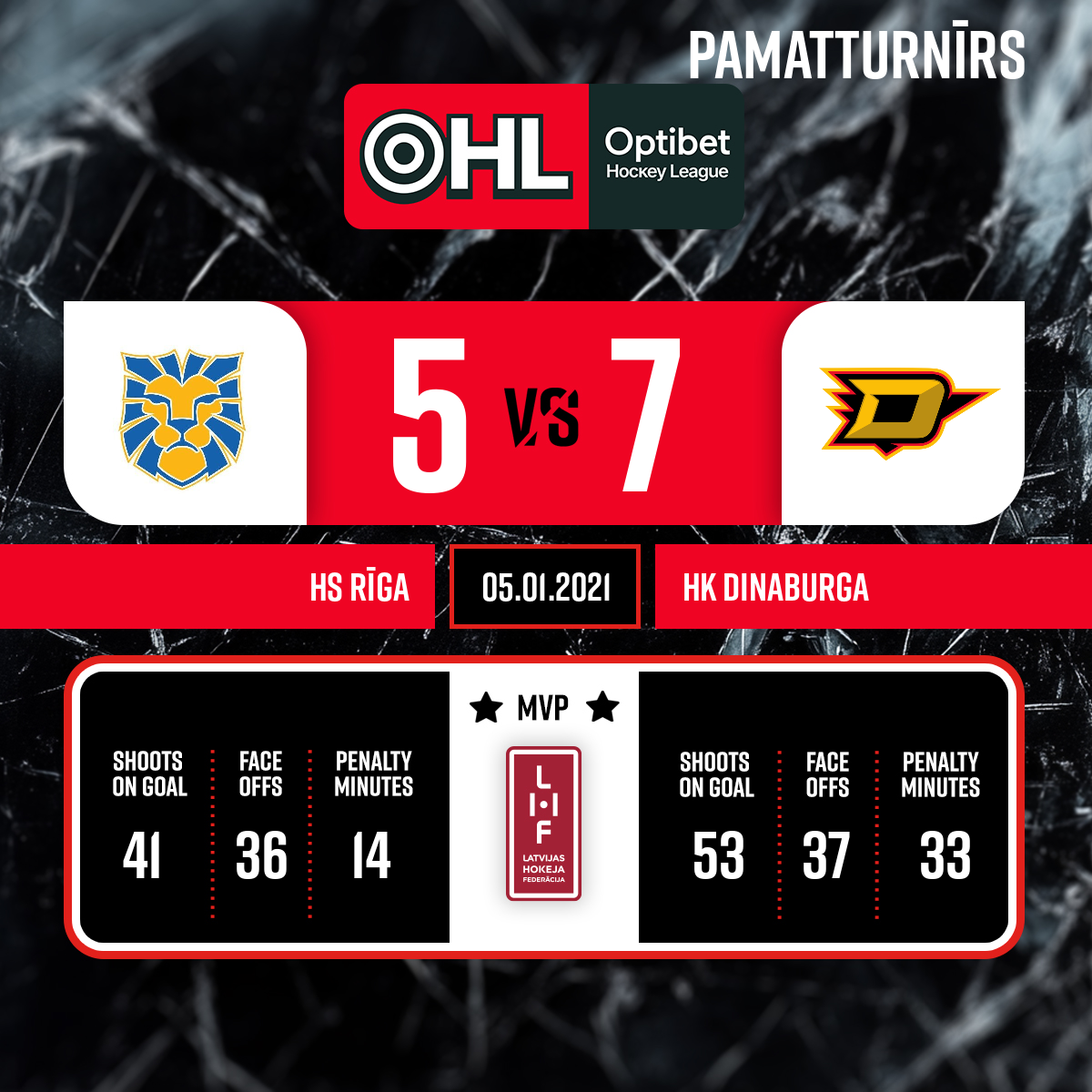 - 60:00P3Spēles labākie spēlētāji: HS Rīga – Vladislavs Koniševs Nr. 11 HK Dinaburga – Ilya Olonov Nr. 96