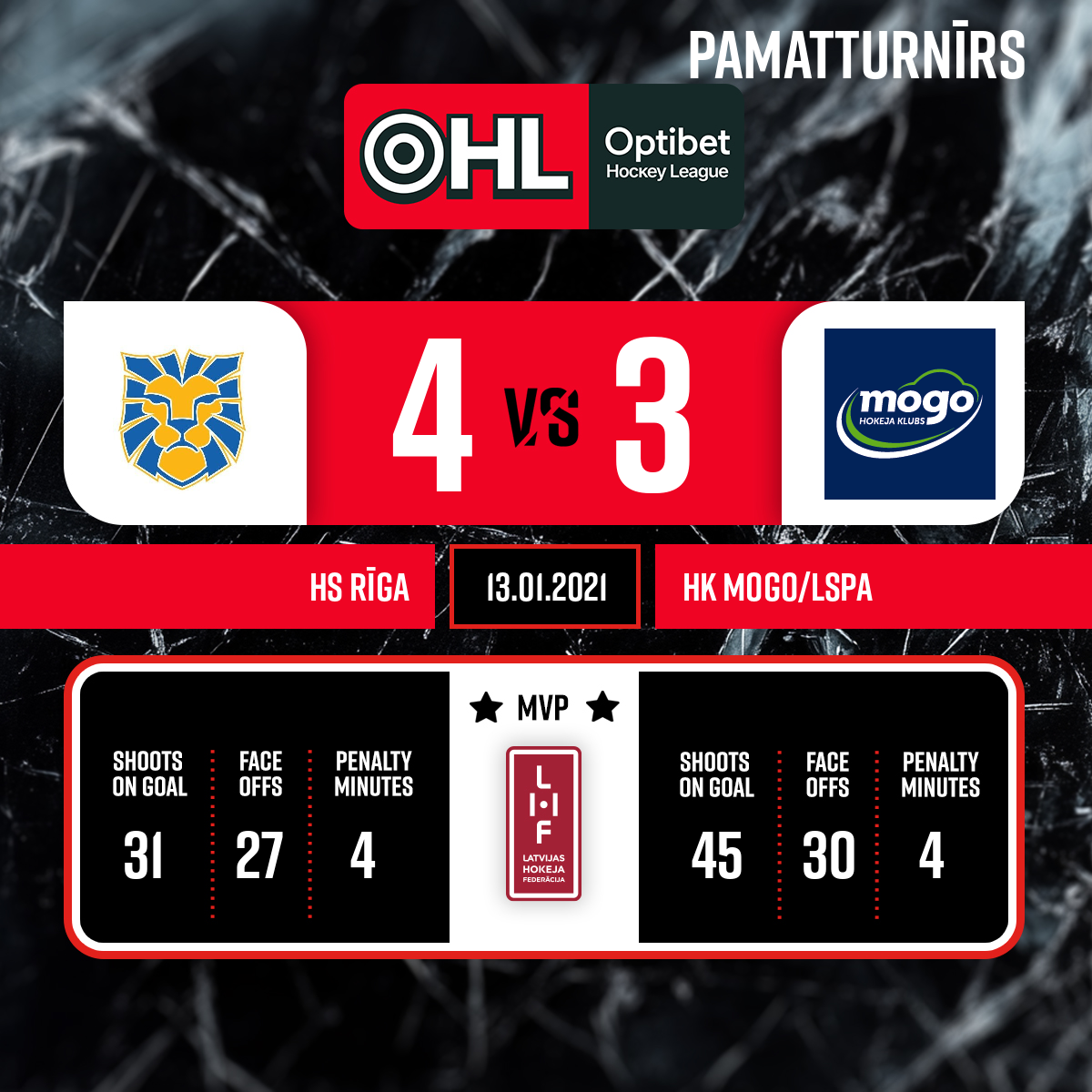 - 60:00P3Spēles labākie spēlētāji: HS Rīga – Pēteris Purmalis Nr. 18 HK Mogo/LSPA – Lauris Rancevs Nr.47