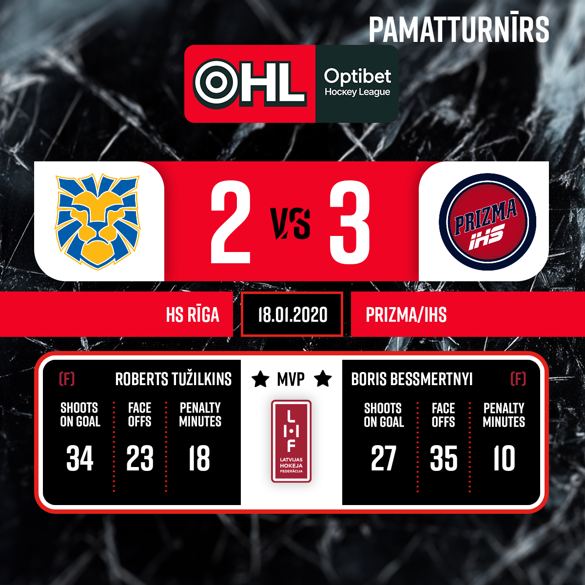 - 60:00P3Labākie spēlētāji: HS Rīga - #13 Roberts TUŽILKINS Prizma/IHS - #41 Boriss BESSMERTNYY