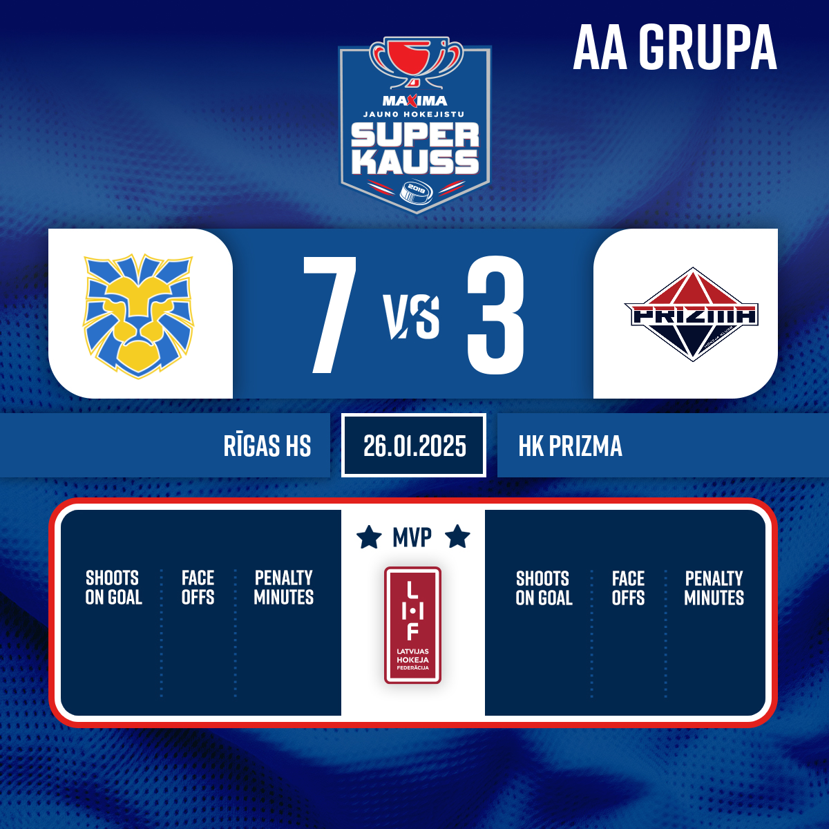 - 60:00P3Goalkeeper out#30 Feliks OĻEIŅIKOVS