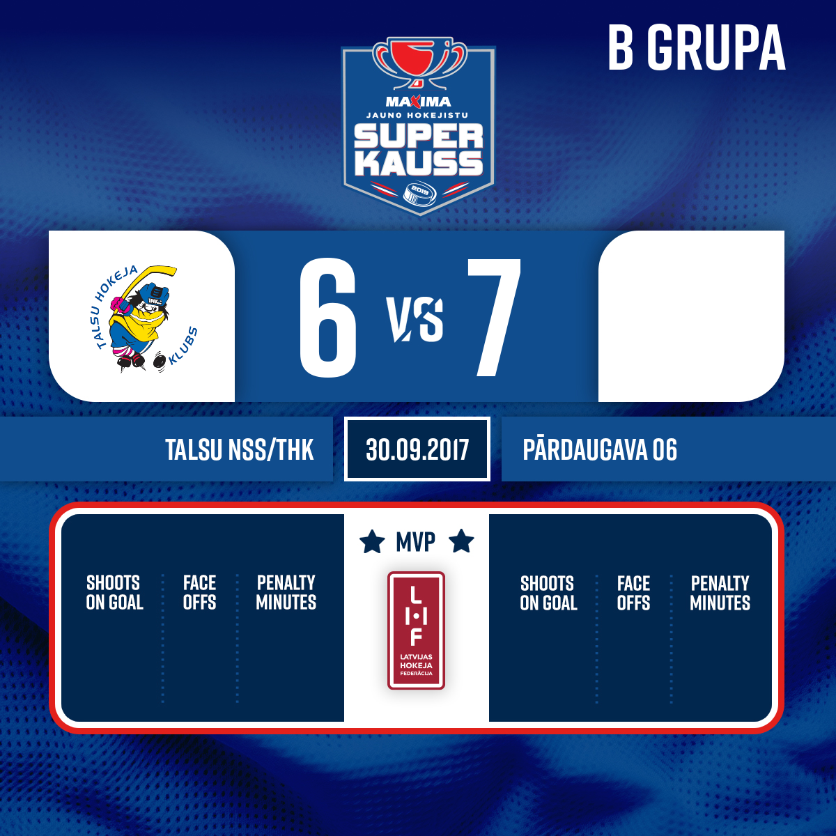 - 06:40P1Powerplay goal#13 Niklāvs KALNIŅŠAssists: #37 Marts KUMPIŅŠ, #15 Maksims HARITONCEVS+1