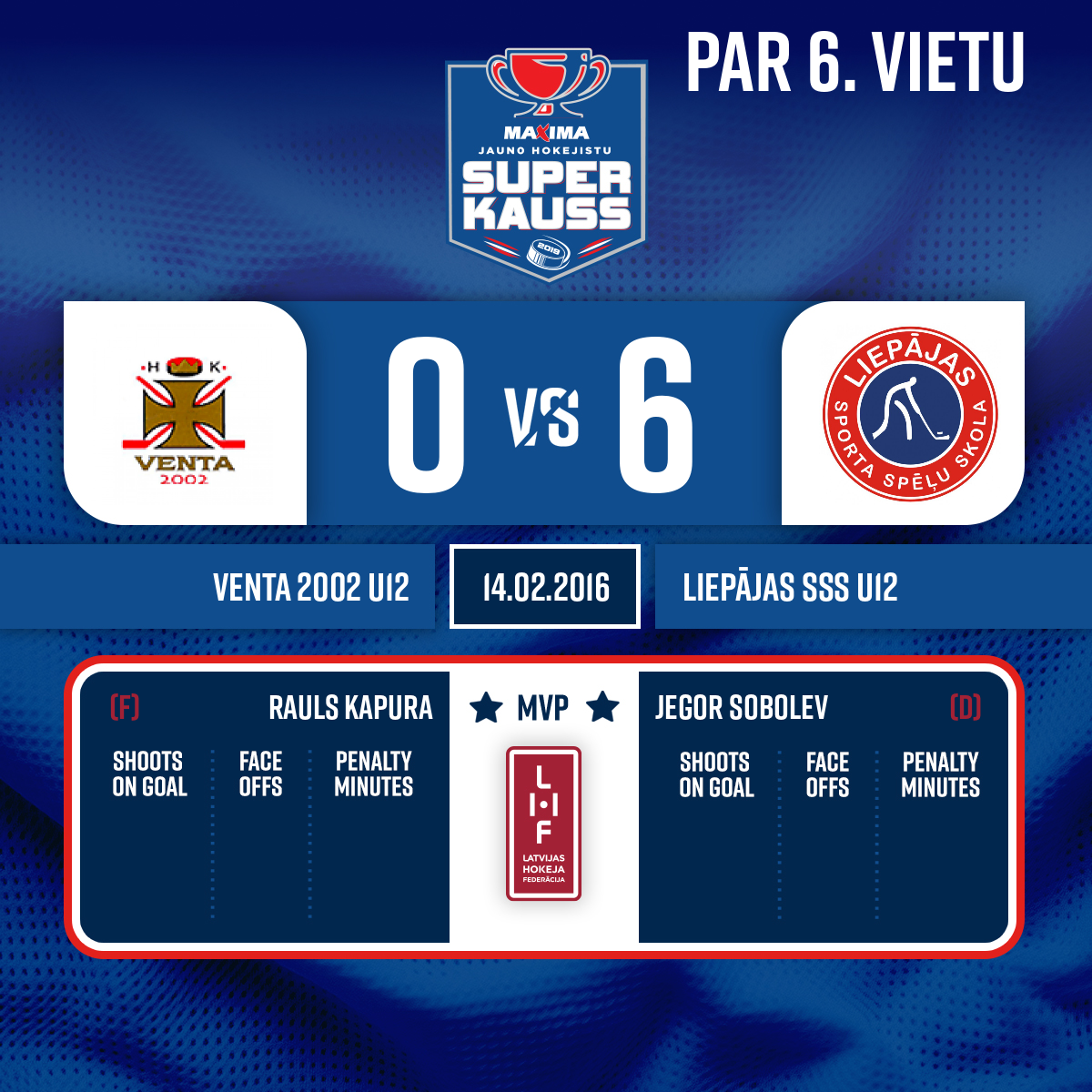 - 25:36P2Goal#11 Rūdolfs LAIVENIEKSAssists: #2 Kristers KUZŅECOVS, #17 Rainers PAVLOVIČS