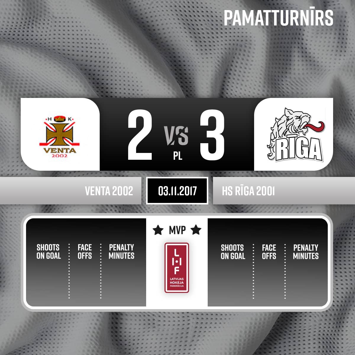 - 41:12P3Goal#52 Oskars GRIGULISAssists: #82 Deniss KATERIŅIČS, #4 Ģirts ZVIRGZDIŅŠ