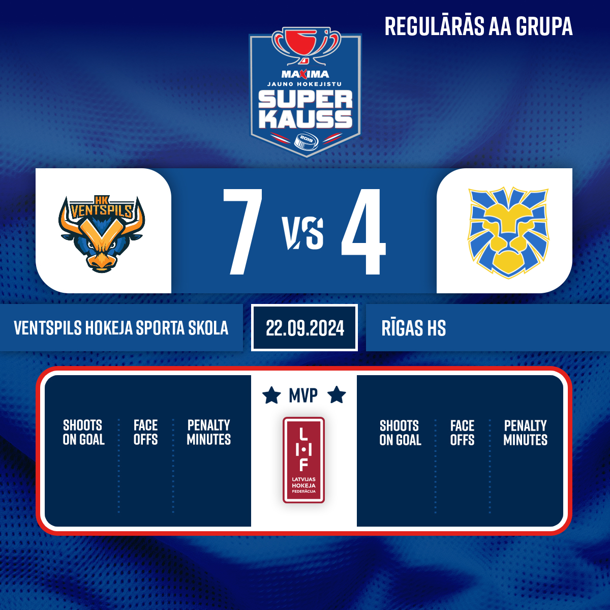 - 20:00P1Goalkeeper out#31 Stīvens KRĒSLIŅŠ