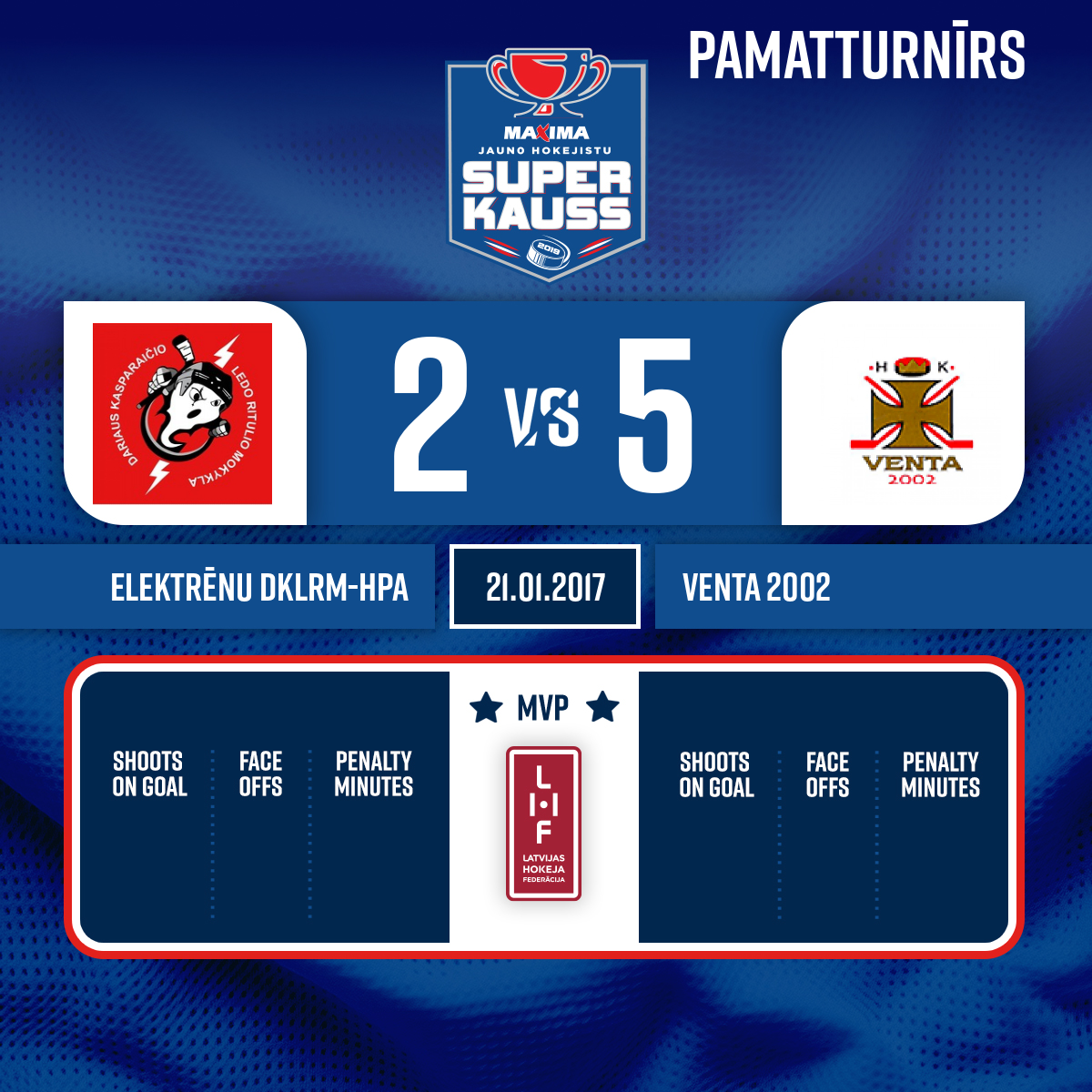 Piespēles: #99 Deniss KATERIŅIČS#18 Kaspars MENDZIŅŠ2:5VV1, 39:00#95 Uvis GROSMANIS